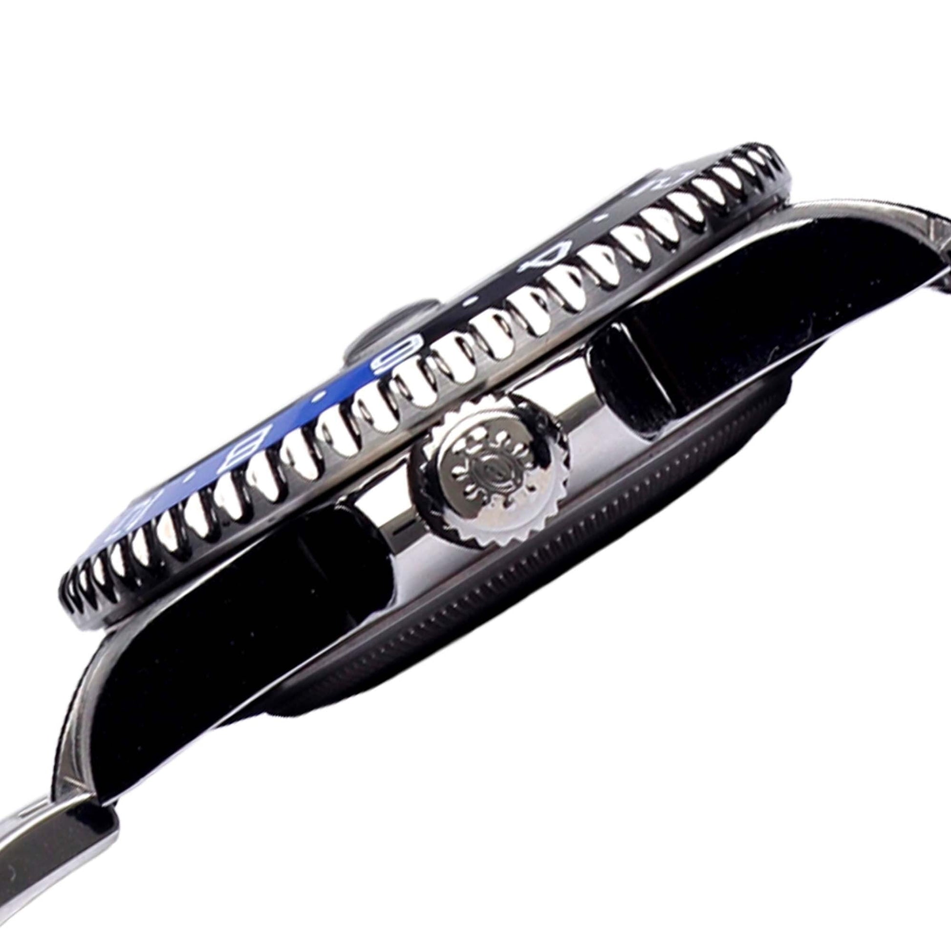 | 特徴 | ●逆回転防止機構付き回転ベゼル ブルー&レッド:高強度アルミ合金製 ブラック&ブルー:セラミック製 ●サファイヤクリスタルガラス風防 モース硬度(硬さを示す指標)は9と、ダイヤモンドのモース硬度10に次ぐ硬度のガラス。 ●316Lステンレス 通称サージカルステンレス。他のステンレスより耐食性が格段にグレードアップされて変色したり錆びたりし難いステンレス。 ●サイクロップレンズ付き 日付を拡大表示 ●スーパールミノバ(BGW9) 時針、分針、秒針、GMT針、ダイヤルインデックス ●防水仕様のねじ込み式リュウズ 防水防塵パッキン使用 ●5気圧防水 食器の水洗いやお風呂の洗浄のほか、農業や漁業など水に触れる作業時にも使用することが可能 ヨット、釣りといったスポーツを楽しむ際にも身につけることができるが、高い水圧のシャワーを浴びたり、蛇口から勢いよく出ている水道水に当たったりすると、時計内に水が浸入する恐れがあるので注意が必要です。 |