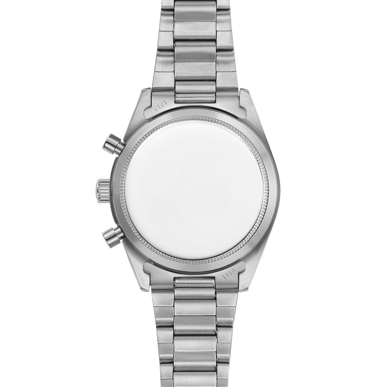 【ヴィンテージへのこだわり1】丸みを強調したフォルムで、当時の高級時計に使用されていたステンレスで仕上げたケース。盤面の外周メモリは、背面からよく映える赤で統一をし、さりげなく配置された正方形型のアワーマークが特別感を演出します。