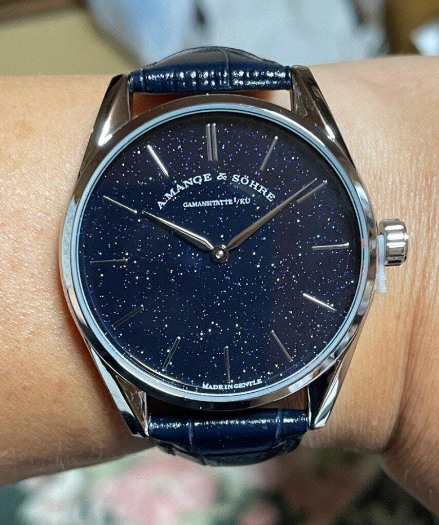 この時計の文字盤にはブルーゴールドストーン(天然石)を使用しております。