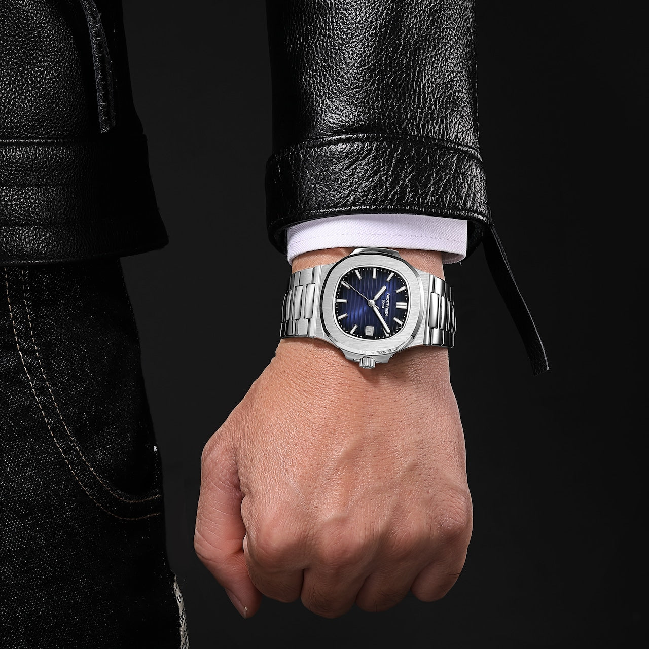 モダンで洗練されたデザインながらも、信頼性の高い日本製クォーツを備えた、デキる男の一本。