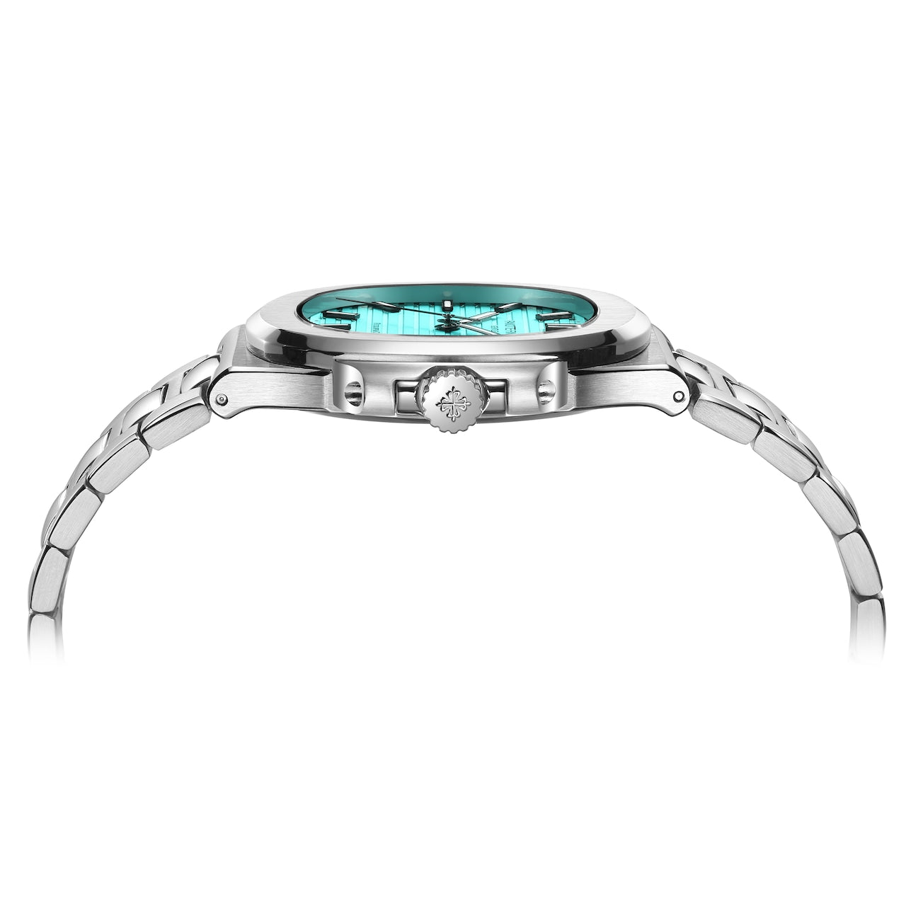 この腕時計の魅力は、エレガントなデザインだけではなく、ベルトは16のパーツから構成され優しく包み込む。
