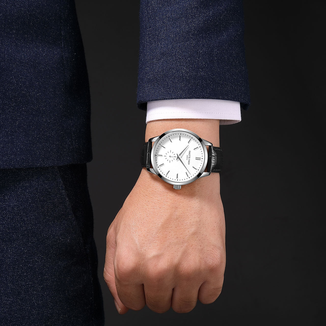 シンプルで美しいラウンドケースと視認性の高い立体的な針やインデックスが特徴のモダンで洗練されたデザインながらも、信頼性の高い日本製クォーツ時計を備えた、デキる男の一本。