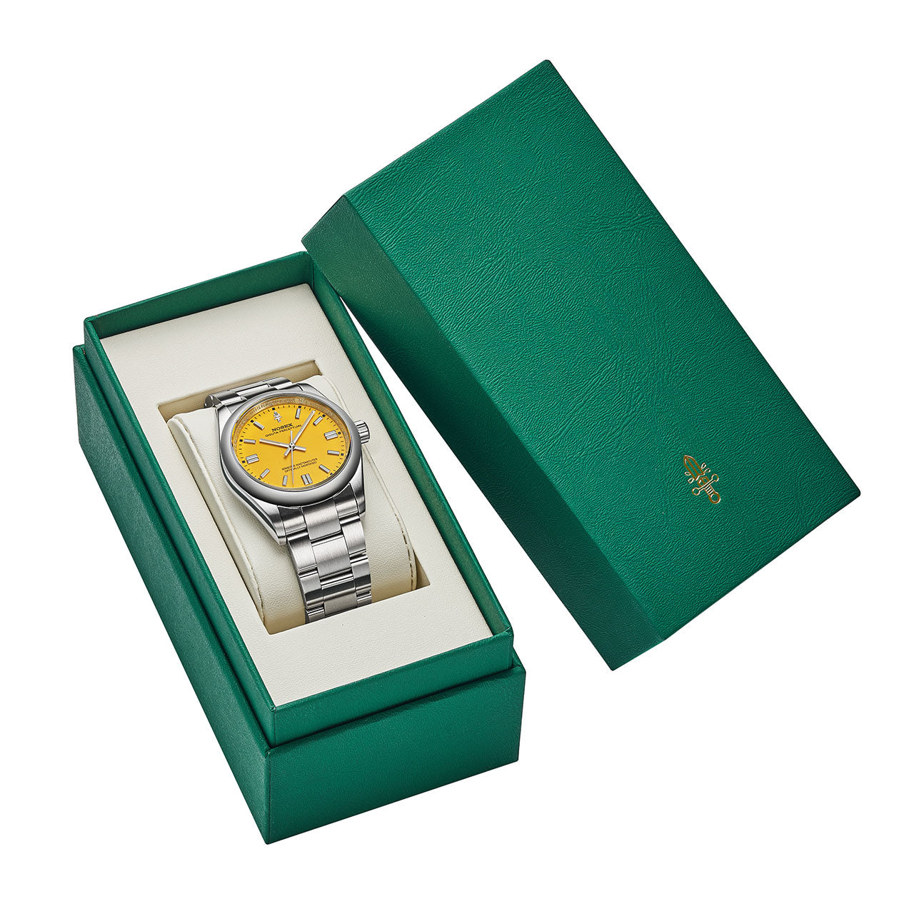 そんなあなたに贈る「オイパセ」36mmは、程よく腕に乗るサイズで、文字盤は全部で5色展開。普段使いからオシャレにまで幅広く対応し、男女を問わずプレゼントにもぴったりです。