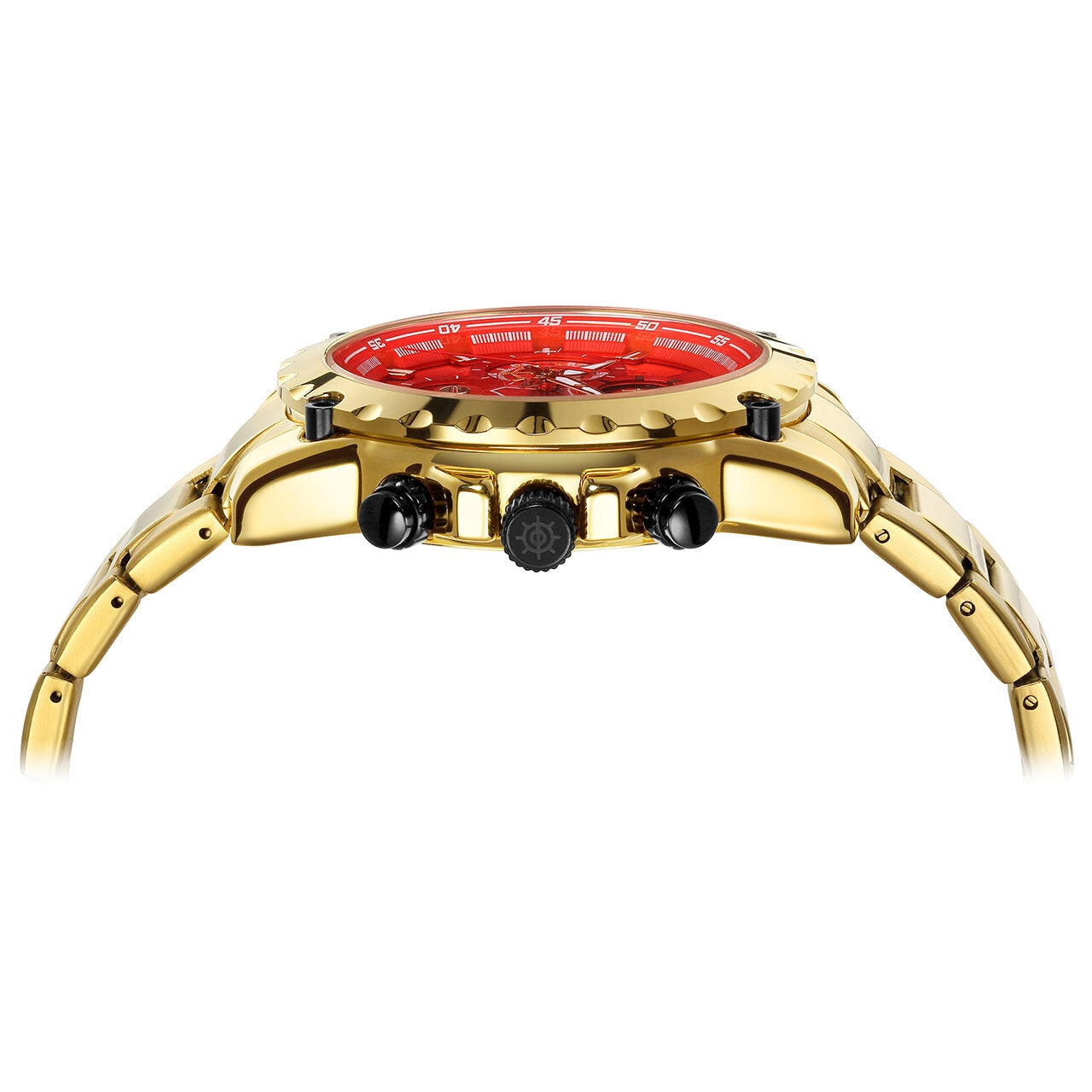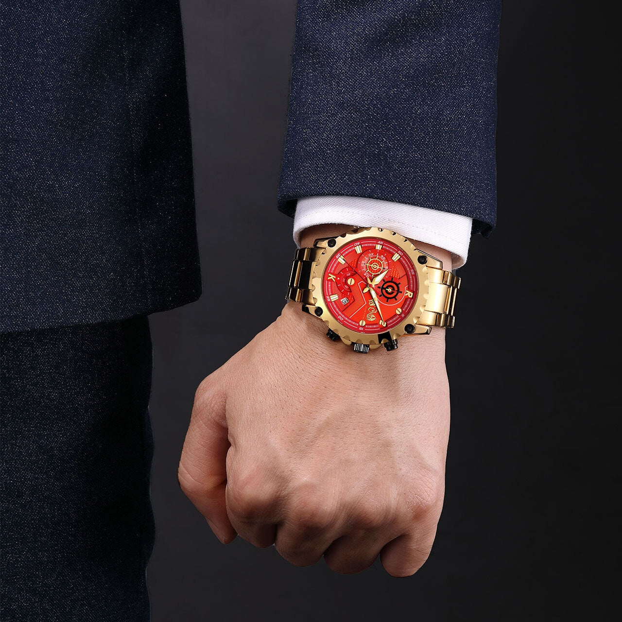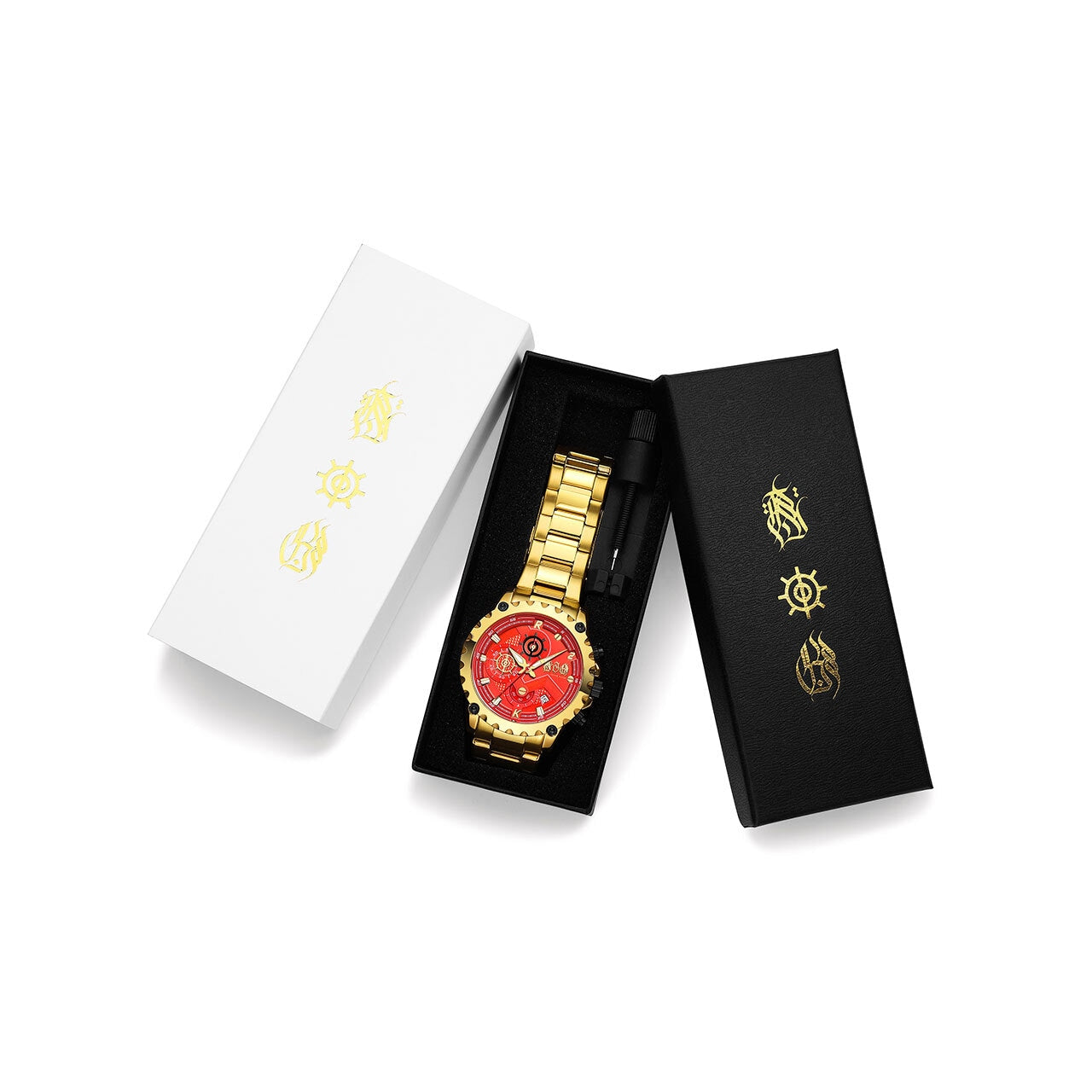 燃えるようなレッドフェイスに、重厚なゴールドメタルのボディ。遊び心とラグジュアリーのバランスを絶妙に操り、見る者すべてを挑発するこのデザインは、まさに“身に着けるアート”。