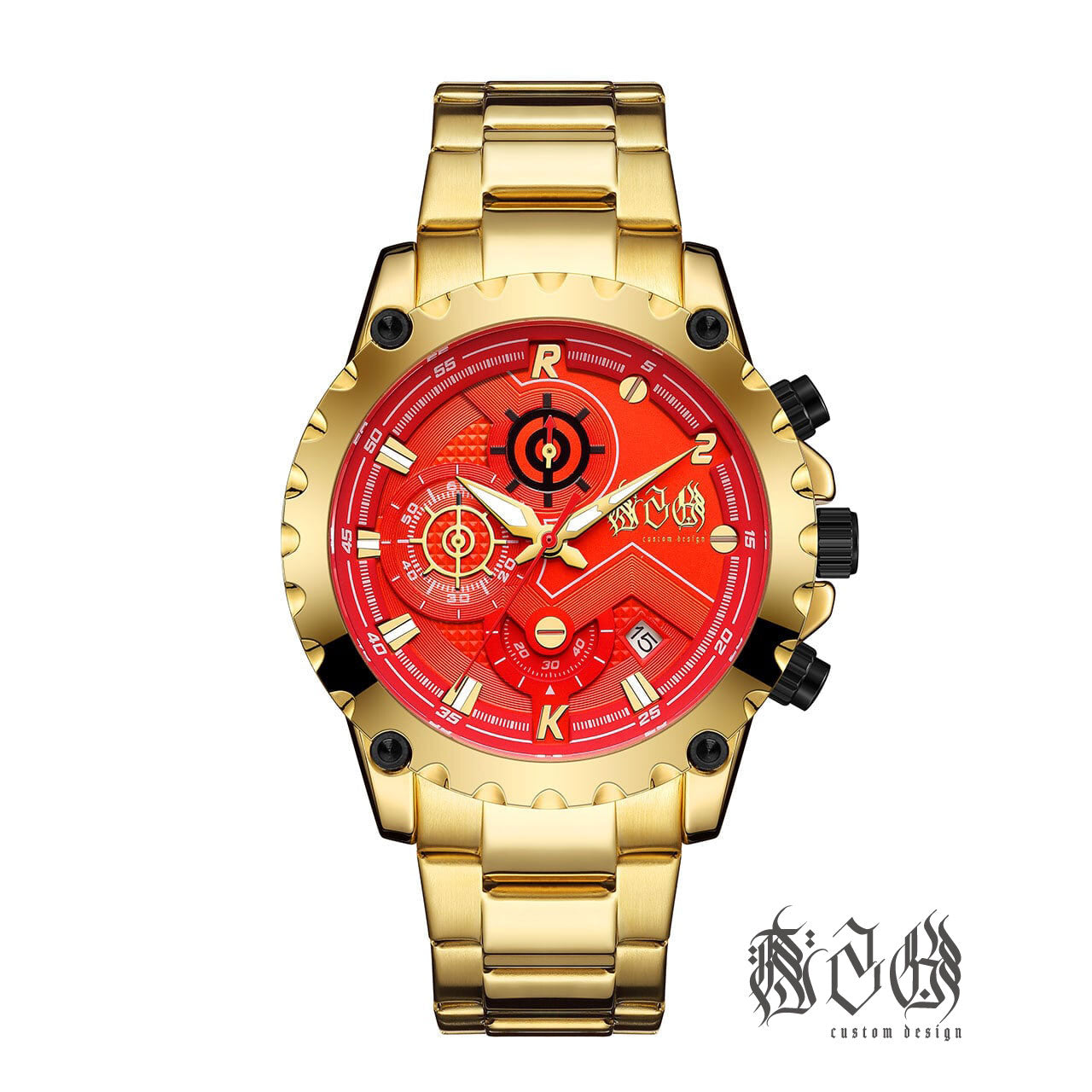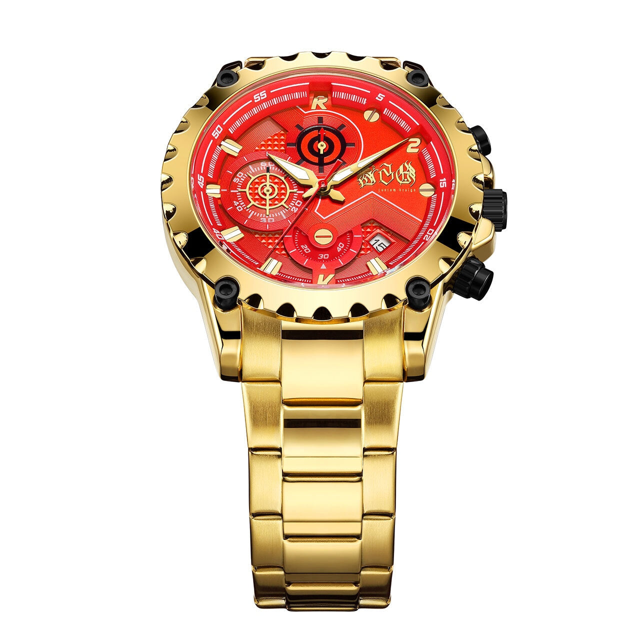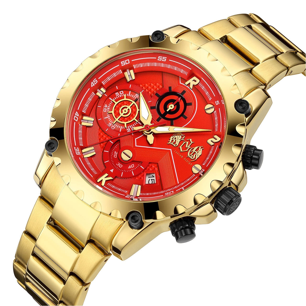 燃えるようなレッドフェイスに、重厚なゴールドメタルのボディ。遊び心とラグジュアリーのバランスを絶妙に操り、見る者すべてを挑発するこのデザインは、まさに“身に着けるアート”。